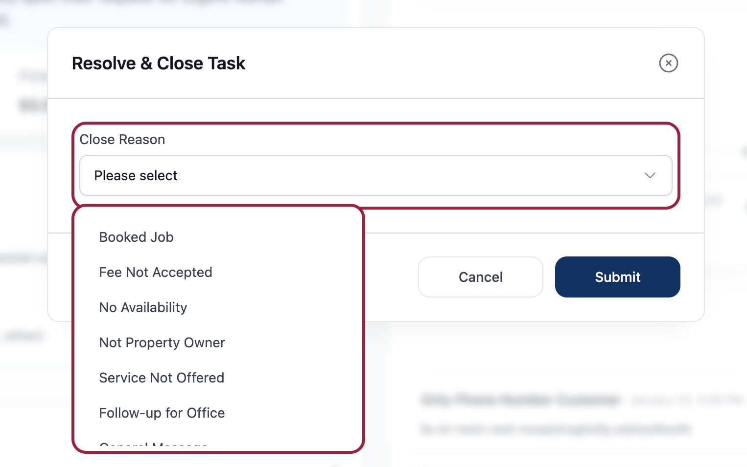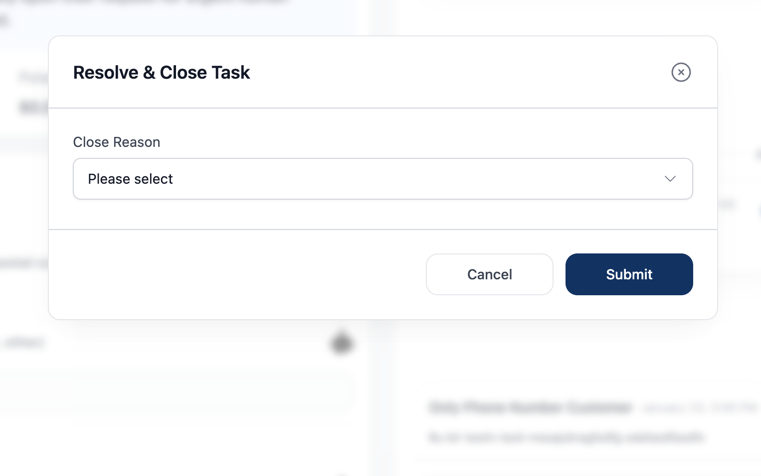 | Close | Return to queue (wrong task, can't handle) |